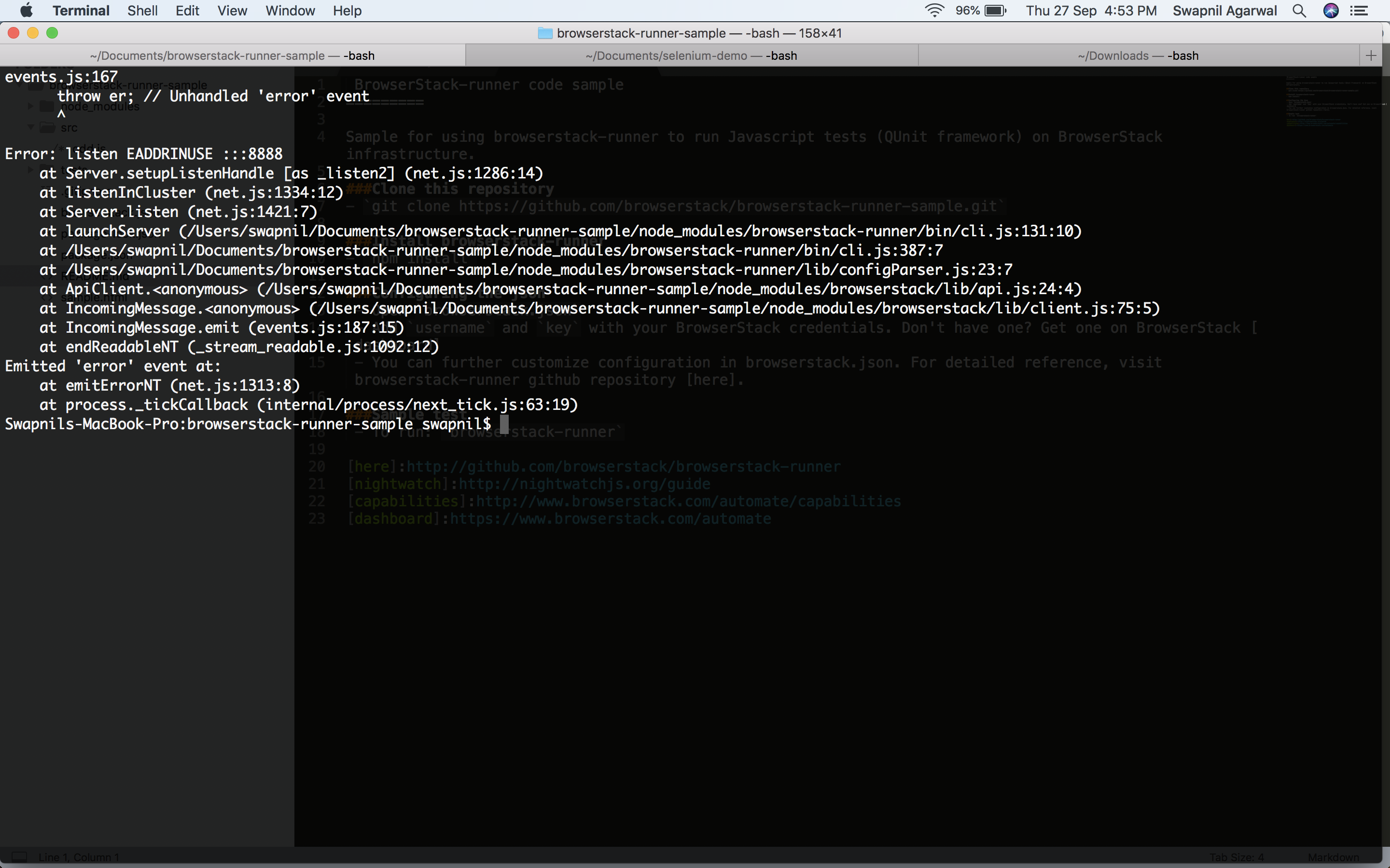 I configured the ```browserstack.json``` file with my username and key. I run ```./node_modules/.bin/browserstack-runner``` command but it crashes. <img width="1440" alt="screen shot 2018-09-27 at 4 53 11 pm" src="https://user-images.githubusercontent.com/5382204/46142897-0aec7c00-c276-11e8-867e-1f36407f0162.png">